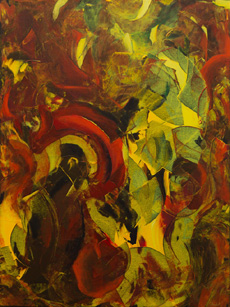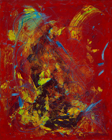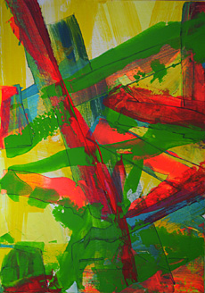 Abstrakte namenlose Farbkompositionen, überwiegend von einer Lokalfarbe dominiert und mit starkfarbigen Kontrastakzenten oder -spuren versehen, konfrontieren den Betrachter mit unbekannten Welten.