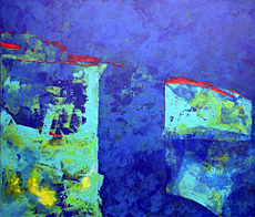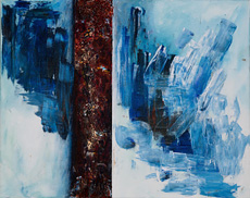 Zwar sind sämtliche Arbeiten betitelt, doch spielen diese inhaltlichen Angaben eine untergeordnete Rolle. Sie bieten allenfalls eine Orientierungshilfe. Wie etwa bei STREITbar von 2008. Auslöser dieses Bildes war eine weit zurückliegende Geschichte von zwei zutiefst miteinander zerstrittenen Familien. Das Bild selbst vermittelt allenfalls eine vage Ahnung dieses Geschehens. Wie ein verunklärender Schleier der Zeit scheint sich vielmehr ein miteinander versöhnliches Blau über die Bildfläche gelegt zu haben und lässt zwei hellere Partien links und rechts bestenfalls als zwei nebulöse Grabsteine vermuten.
