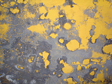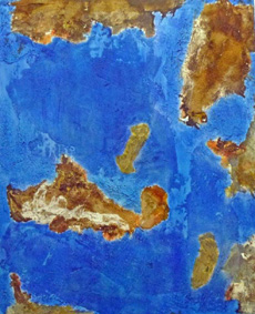 Ein blau changierender Grund mit rotbraunen Linien- und Fleckenstrukturen in Kassel I mag an eine Eisfläche mit Sandspuren erinnern; vielleicht ist es „nur“ ein verletztes Metallteil mit Rostausblühungen. Und ganz gleich, ob es sich bei Barri Gotic mit seinen schwefelgelben Flecken auf asphaltgrauem Grund um Ausblühungen auf einer Wandfläche handelt – „auf den zweiten Blick“ schafft Hein Bohlen harmonisch klingende Farb- und Formwelten aus vermeintlich unwerten, zerstörten und „entsorgten“ Objekten, die ursprünglich in keinem Zusammenhang mit Kunst standen.