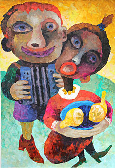 In klaren, bunten Farben erschöpft Gennady Karabinskiy Gestalten, die aus unbekannten Geschichten zu stammen scheinen, Stillleben oder Wesen, die Fragen aufwerfen.