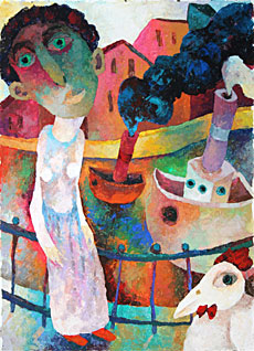 Mit großen Augen schauen eine menschliche Figur mit übergroßem Kopf und ein vogelhaftes Wesen den Betrachter neugierig an. Im Hintergrund dieser fantastischen Begegnung am Kai schwimmen zwei merkwürdig miniaturisierte Schiffe; mächtige dunkle Rauchschwaden steigen vor einer Häuserkulisse auf.
