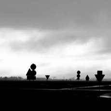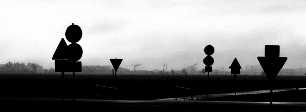 Auffällig ist die konsequente Abwesenheit der menschlichen Existenz in den Arbeiten. Das wird umso deutlicher dort, wo Zeugnisse seiner Anwesenheit nahezu übermächtigen ins Bild gerückt sind. So wird eine Schwarz-Weiß-Aufnahme von allbekannten Zeichen dominiert, die sich – im Schattenriss ihrer Zweckbestimmungen beraubt – nurmehr wie sinnlose, störende, ja verstörende Fremdkörper vor einer weitläufigen Landschaftskulisse in einer überzogenen Wichtigkeit behaupten. Mit aggressiver Schärfe schneiden sie in einen Bewusstseinshorizont einer geradezu lyrischen Landschaftsschilderung – und künden niemandem nichts.