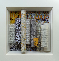 Die auf unterschiedliche Gründe überführten Schriften lösen sich zu Liniengespinsten auf, die als grafisches Gestaltungsmittel und nicht mehr als Informationsträger fungieren. Verschiedentlich werden Bildflächen raumgreifend, stehen wie Schriftrollen nebeneinander und erfahren durch tiefe Rahmungen geradezu spirituelle Aufladungen. Einen ähnlichen Anschein kostbaren Inhalts verspüren fächergleich geöffnete Bücher mit reiner, weißer Schrift auf transparenten „Blättern“.
