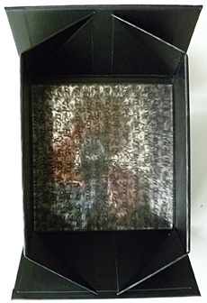 Schwarze Objektkästen verbergen ihren Inhalt vor flüchtigen Blicken. Erst beim Herantreten fällt der Blick in die Tiefe. In ungreifbaren Schichten staffeln sich Schriften und unerklärliche nebulöse Formen vor einer rätselhaften Helligkeit.
