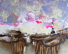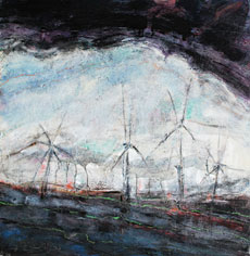 Vor diesem Hintergrund offenbart etwa das 2015 entstandene Spinning Mills 2 einen äußerst bedenklichen Inhalt: Eine Reihe hoch aufragender Windmühlen ist von gleißendem Licht zu weit emporgehobenen Sterngebilden verunklärt. Wie Kämpfer für eine saubere, überhaupt bessere Welt scheinen sie alles Düstere, Bedrohliche um sich herum aufzusprengen und wegzublasen – vielleicht jedoch erblicken wir den genau umgekehrten Fall, in dem sich zwei übermächtige, allseitige Dunkelsphären immer näher zusammenschieben, um in wenigen Augenblicken noch den letzten Widerstand einer hellen Hoffnung zu verschlingen. Andere Landschaftsbilder werfen bereits in ihren Titeln, wie Fracking, kritische Fragen auf: Vor einem hell schäumenden Horizont entspannt sich eine unruhig bewegte Landschaft, die von einem ölig-bräunlichen Gemenge überdeckt ist, welches anscheinend alles Leben unter sich verschluckt und verdaut hat. Nichts hat es verschont – eine wahre Apokalypse. Gottlob bestehen daneben etwa mit sichtbar groben Pinselzügen abstrahierte durchaus idyllische Landschaften, in denen sich Ruhende Rinder fern jeder Bedrohlichkeit niedergelassen haben.