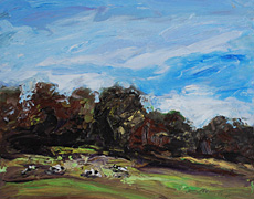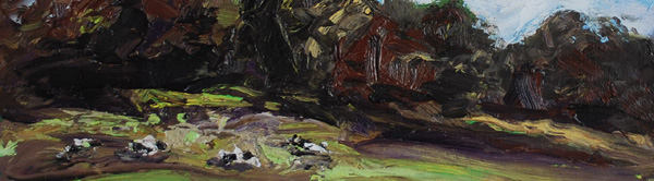 Hartmut Bleß, Ruhende Rinder, 2017, Öl/Hartfaser (Ausschnitt)