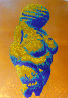 Auf der Spurensuche nach weiteren „Göttinnen“ taucht Schüler noch tiefer in die Vergangenheit und zeigt uns die altsteinzeitliche Venus von Willendorf; doch diesmal ganz im Widerspruch zu ihrer monochromen Steinfarbigkeit in kräftigen Farbakkorden, die an mit dem Computer generierte Solarisationen erinnern.