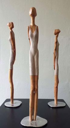 Kaum haben Heinrich Schülers Mythische Göttinnen die Sezession Nordwest verlassen, ziehen "moderne" Frauen von Maren Panke ein. Die extrem schlanken, auf den Fußspitzen stehenden Holzfiguren werfen nicht allein durch ihre Geichtslosigkeit viele Fragen auf.